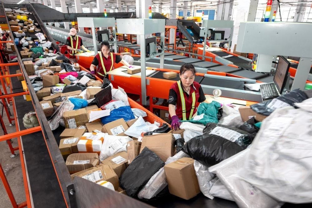 △截至6月30日,今年上半年我國快遞業(yè)務量突破800億件,比2023年提前59天。圖為2024年6月18日,在浙江湖州市長興縣一家快遞企業(yè),工作人員忙著分揀、掃描出庫等工作。