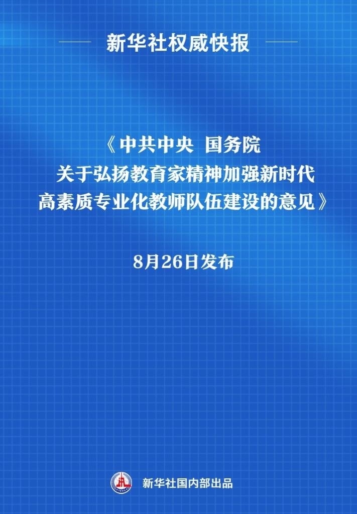 《中共中央 國務(wù)院關(guān)于弘揚(yáng)教育家精神加強(qiáng)新時代高素質(zhì)專業(yè)化教師隊(duì)伍建設(shè)的意見》8月26日發(fā)布。