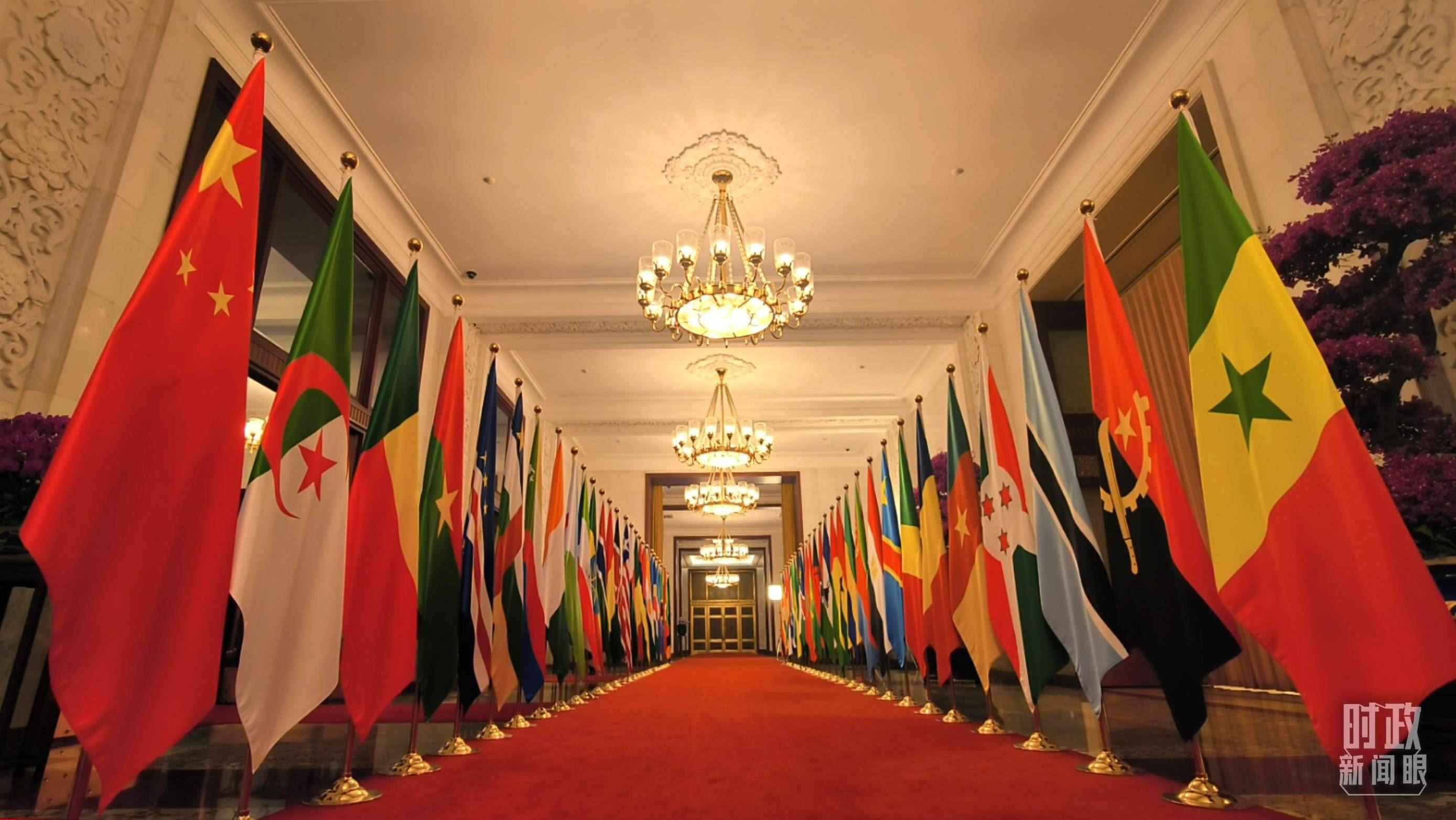 人民大會堂北大廳,中國國旗和中非合作論壇成員國國旗以及非洲聯(lián)盟旗幟交相輝映,巨幅蘇繡壁畫《長城》氣勢恢宏。