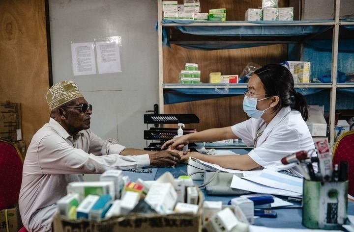 2024年1月11日,中國(guó)第15批援科摩羅醫(yī)療隊(duì)隊(duì)長(zhǎng)潘春熹在位于科摩羅首都莫羅尼的馬魯夫醫(yī)院內(nèi)為患者看病。新華社記者 王冠森 攝