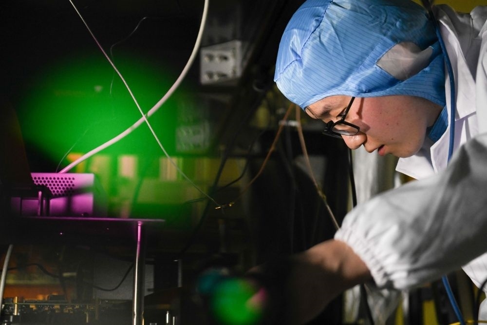 2022年1月31日,中國科學技術大學學生在中國科學院量子信息重點實驗室做實驗。