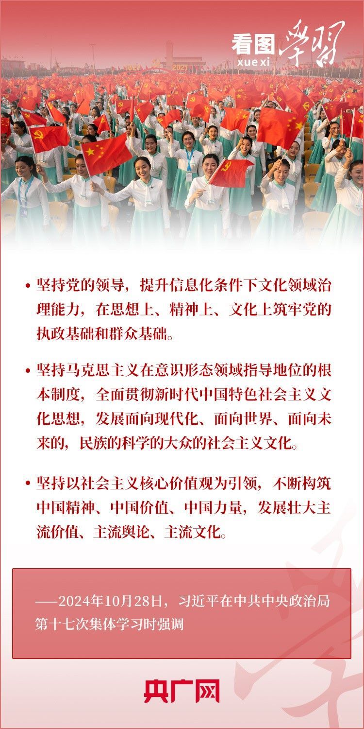 建設文化強國是全黨全社會的共同任務。10月28日,中共中央政治局就建設文化強國進行第十七次集體學習。習近平總書記在聽取講解和討論后發(fā)表重要講話,就錨定2035年建成文化強國戰(zhàn)略目標作出最新部署,強調要“不斷發(fā)展具有強大思想引領力、精神凝聚力、價值感召力、國際影響力的新時代中國特色社會主義文化,不斷增強人民精神力量,筑牢強國建設、民族復興的文化根基?!币黄饋韺W習!