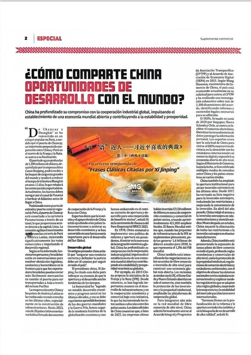 11月14日,秘魯最具影響力的官方報紙《秘魯人報》刊發(fā)節(jié)目在秘魯落播的消息。文章指出,《平“語”近人——習近平喜歡的典故》第三季展現了中華民族開放包容、兼收并蓄的文化胸懷,闡釋了習近平主席提出的推動構建人類命運共同體的這一重大理念,是對“建設一個什么樣的世界、怎樣建設這個世界”給出的中國方案。《秘魯人報》特刊整版刊發(fā)《平“語”近人——習近平喜歡的典故》第三季(西班牙語版)將在秘魯主流媒體落播特稿?!睹佤斎藞蟆饭倬W也同步刊發(fā)了節(jié)目預告消息和海報。