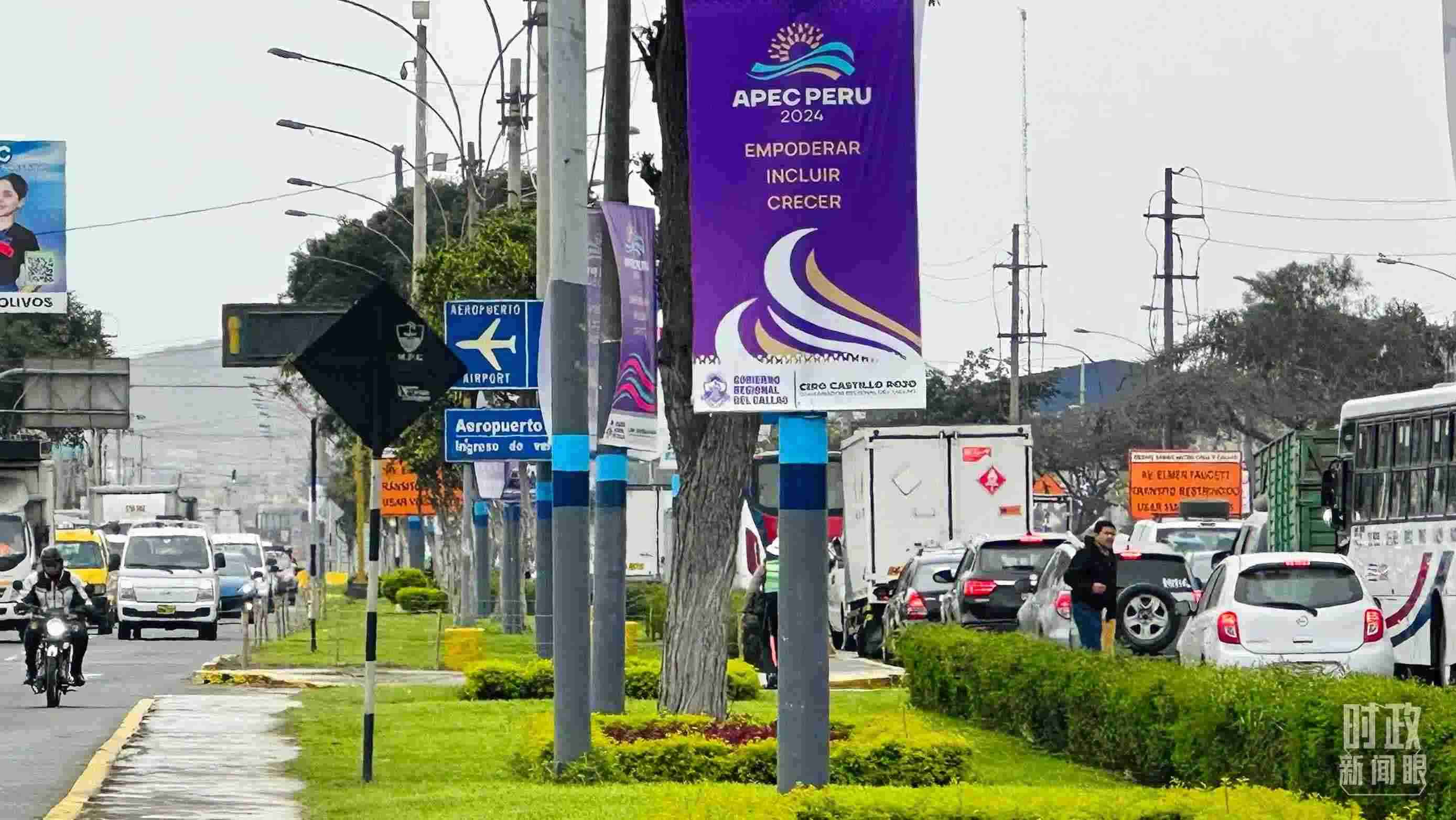 △利馬空軍基地懸掛的中國(guó)國(guó)旗和APEC會(huì)議標(biāo)牌。(總臺(tái)央視記者鄂介甫拍攝)