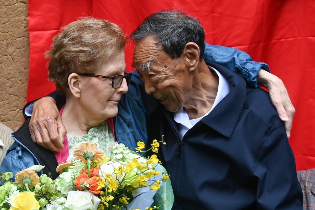 2024年4月17日,在浙江衢州江山市張村鄉(xiāng)龍頭店村,“杜立特行動”3號機領(lǐng)航員查爾斯·奧祖克的女兒蘇珊·奧祖克(左)與村民廖明發(fā)相擁。1942年,村民廖詩原(廖明發(fā)的父親)一家曾悉心照顧跳傘降落的查爾斯·奧祖克。新華社記者 黃宗治 攝