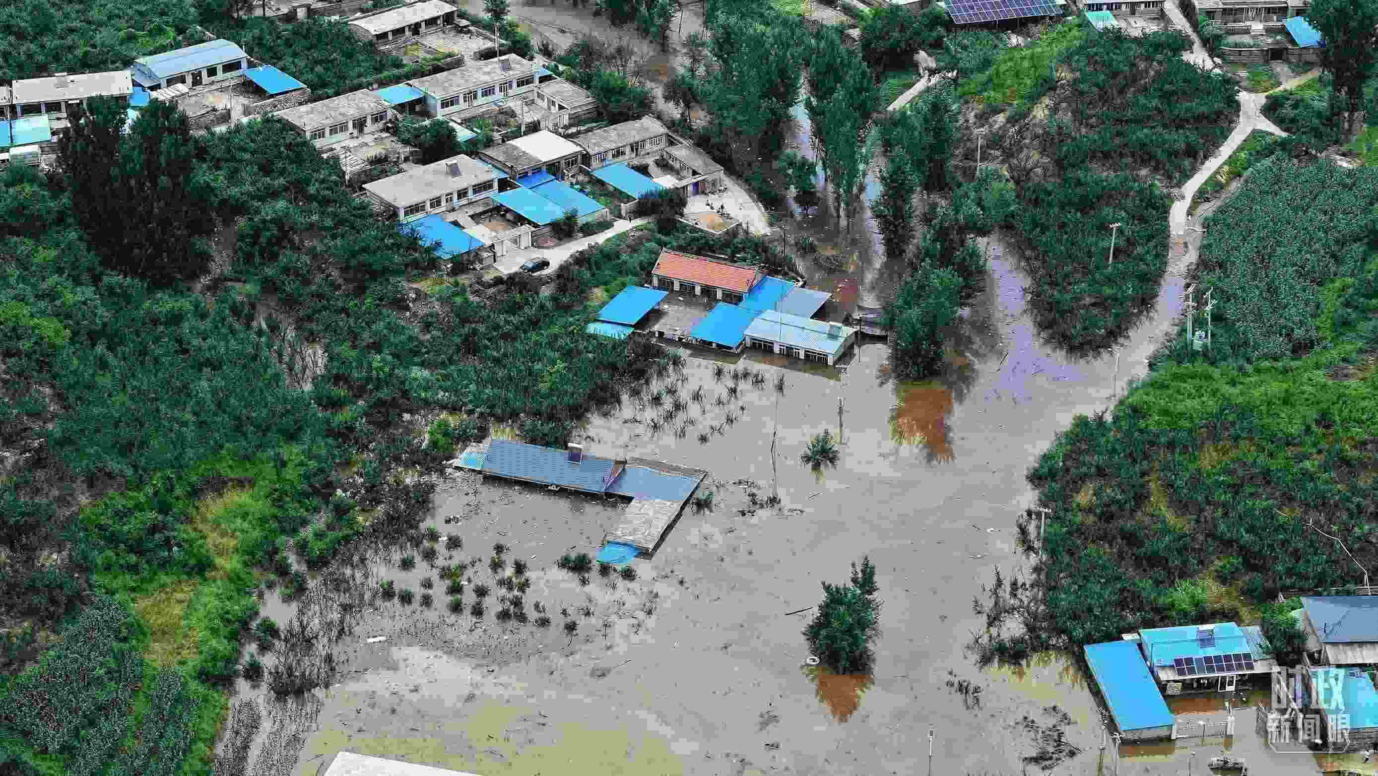 △被洪水淹沒的祝家溝村。