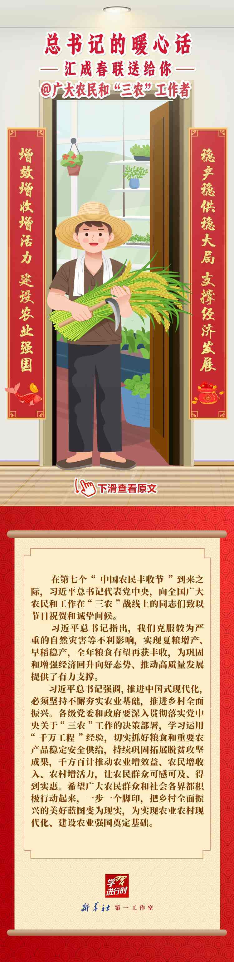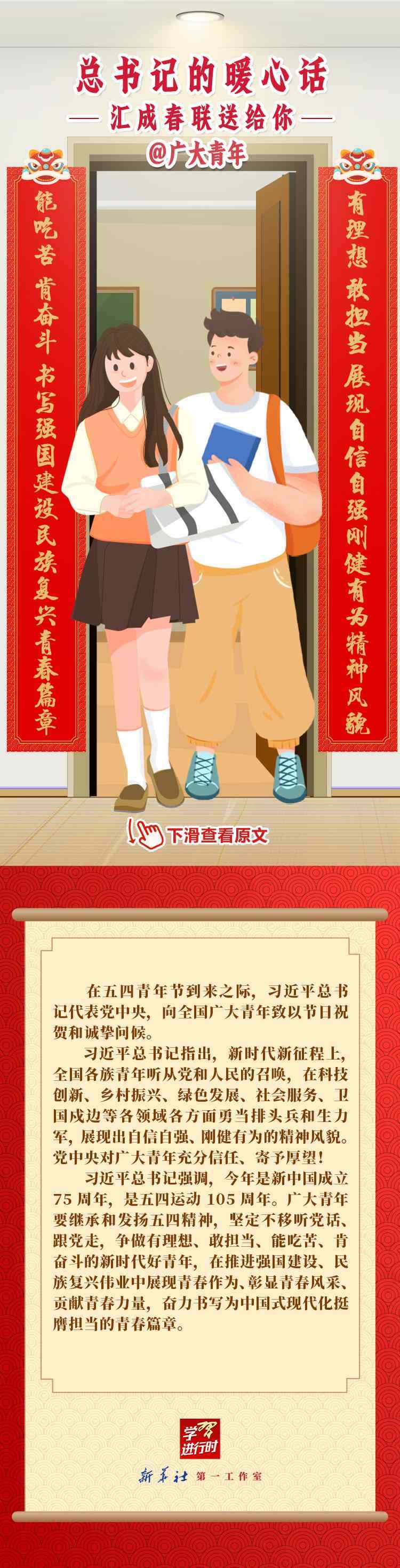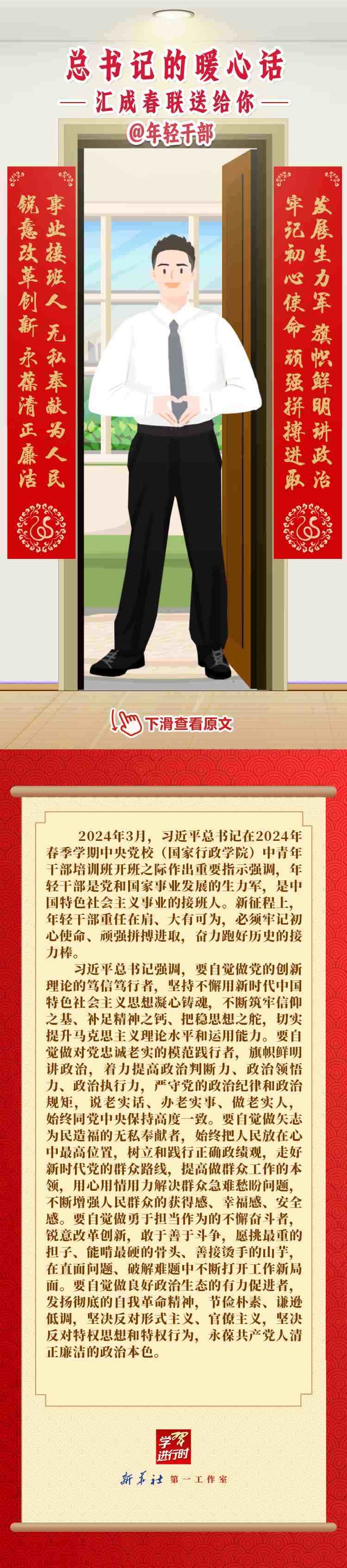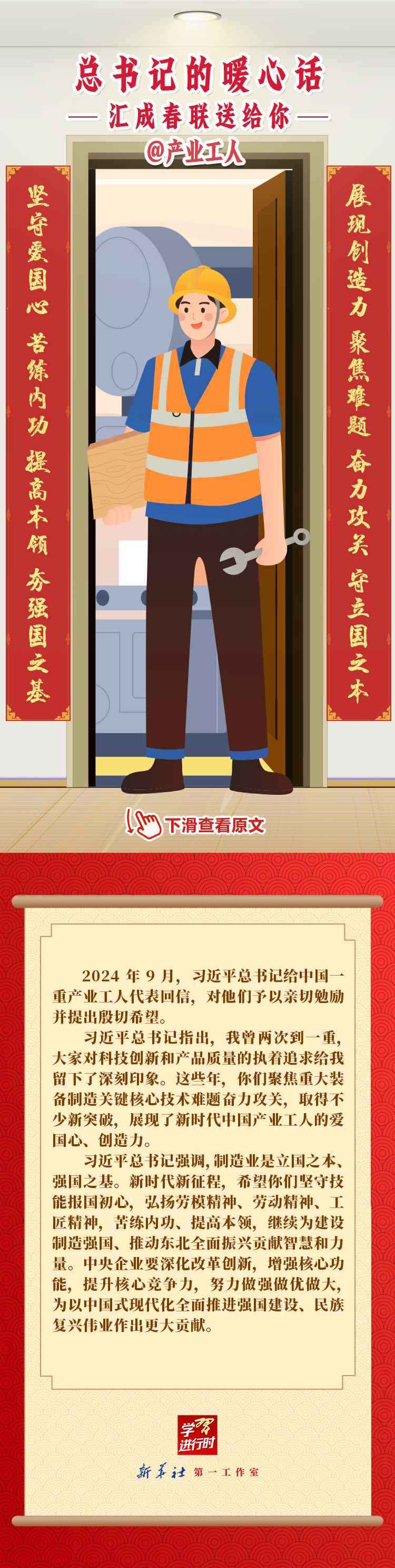 【學習進行時】過春節(jié),貼春聯,寄托人們對新年的美好愿望。過去一年,習近平總書記在不同場合點贊各行各業(yè)奮斗者,說了許多暖心話。新春之際,我們匯編成聯,向新征程上的每一位“主角”致敬,送上新春的祝福。