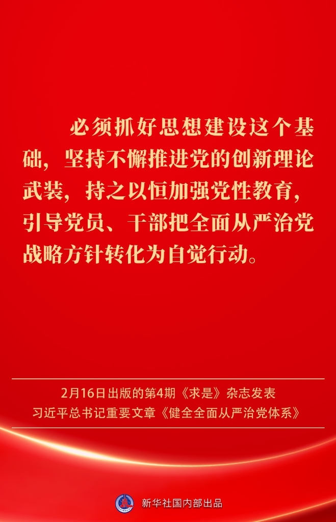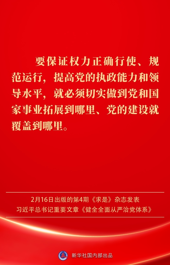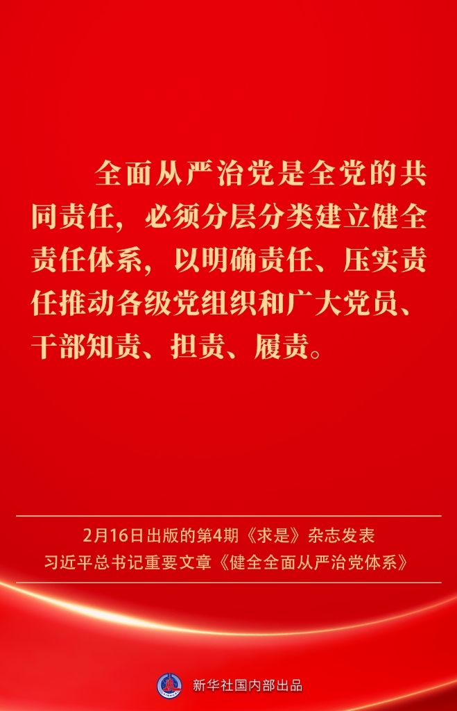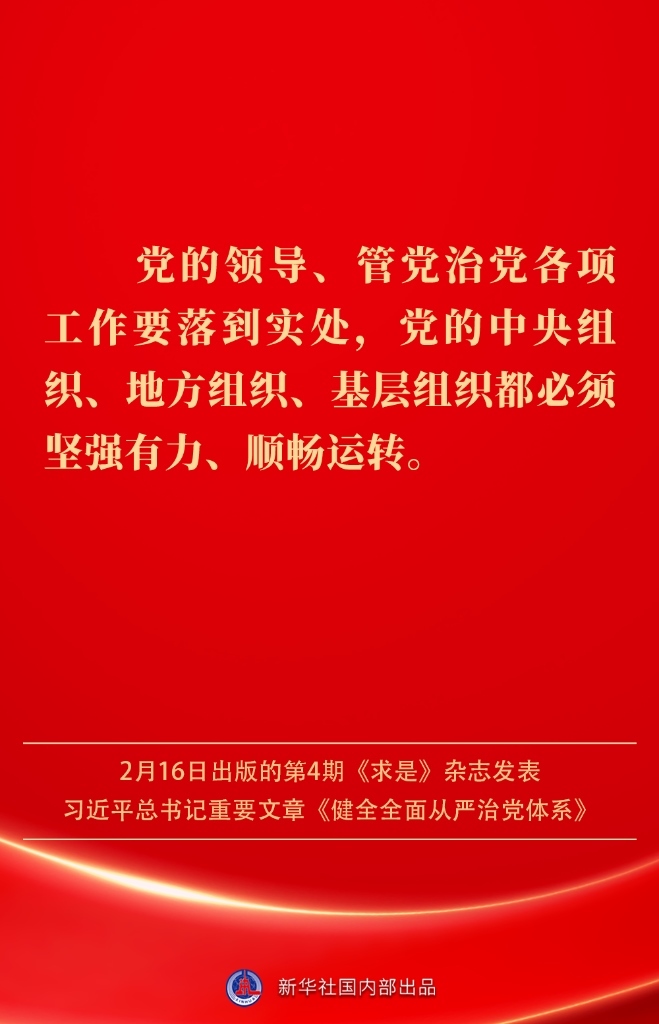2月16日出版的第4期《求是》雜志發(fā)表習(xí)近平總書(shū)記重要文章《健全全面從嚴(yán)治黨體系》。如何進(jìn)一步健全要素齊全、功能完備、科學(xué)規(guī)范、運(yùn)行高效的全面從嚴(yán)治黨體系?習(xí)近平總書(shū)記闡明要旨——
