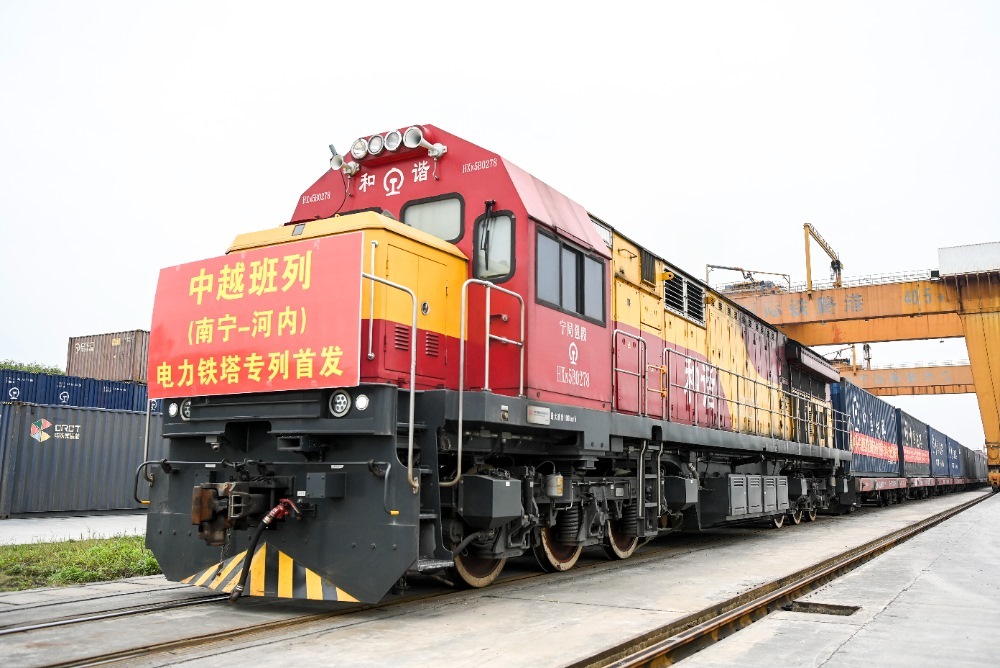 2024年3月8日,在廣西南寧國際鐵路港,電力鐵塔專列準備發(fā)車。當日,一列滿載340噸電力鐵塔的中越班列從南寧國際鐵路港開出,發(fā)往越南河內(nèi)。新華社記者 曹祎銘 攝