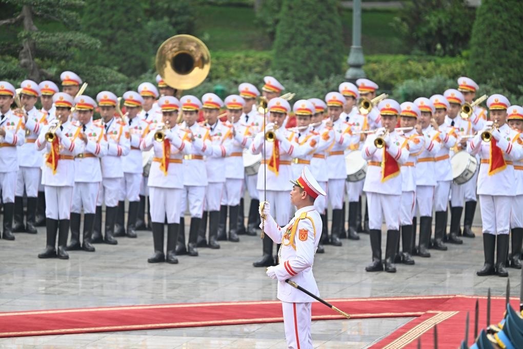 軍樂團奏中越兩國國歌,鳴禮炮21響。