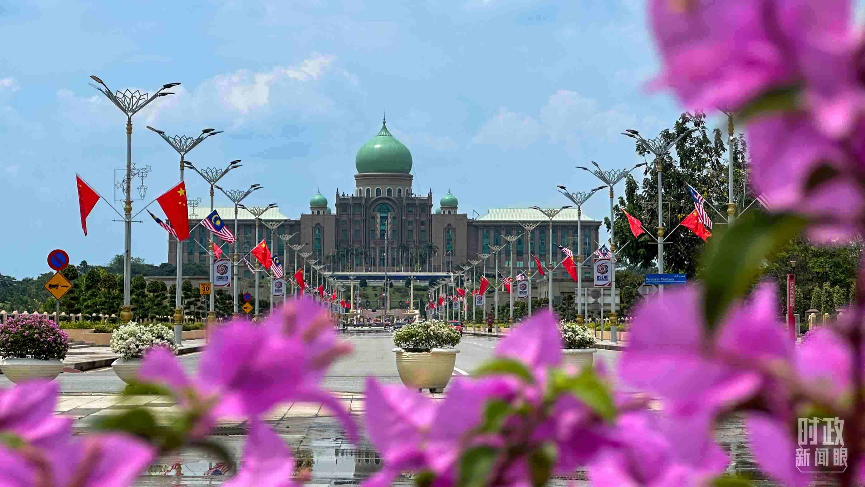 △馬來西亞總理府前懸掛的中馬兩國國旗。(總臺央視記者關(guān)舟拍攝)