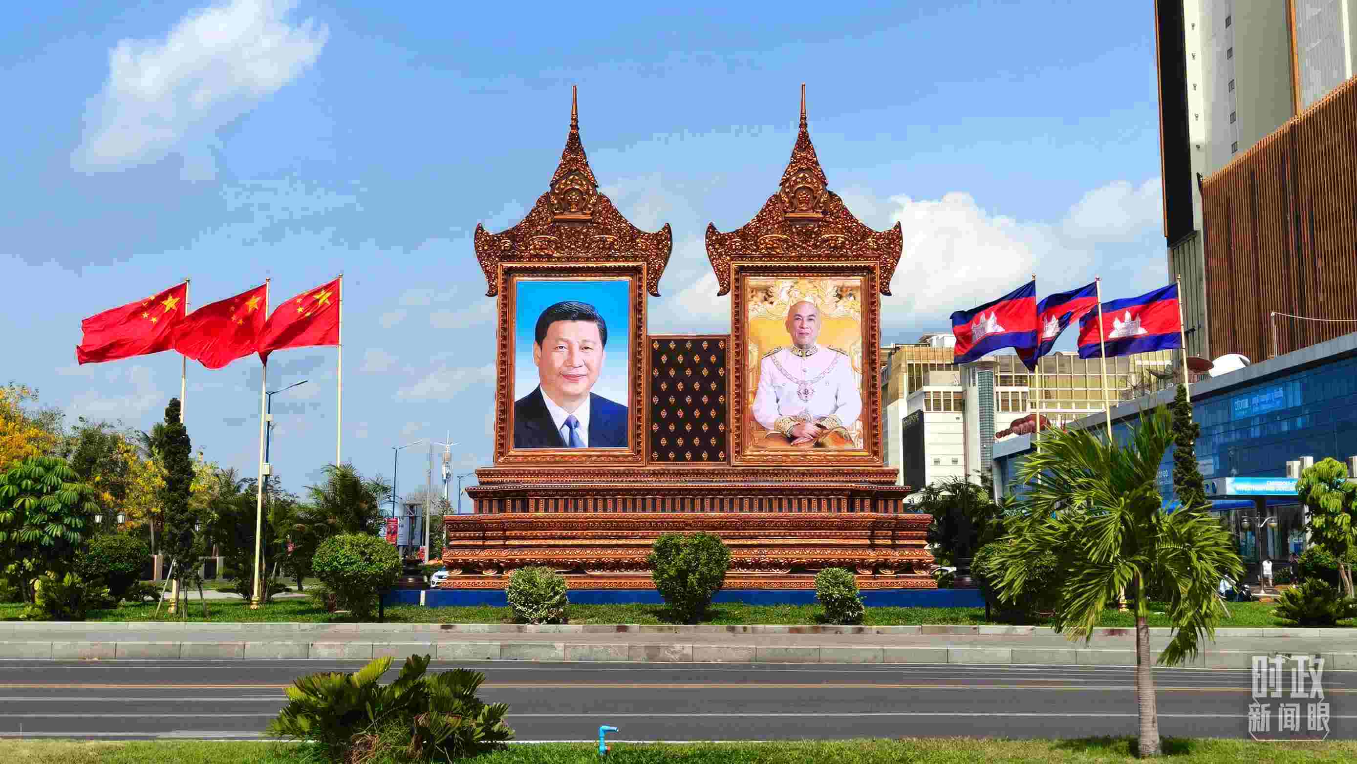 △金邊街頭的巨幅中柬兩國領(lǐng)導(dǎo)人照片和國旗。(總臺央視記者陸泓宇拍攝)