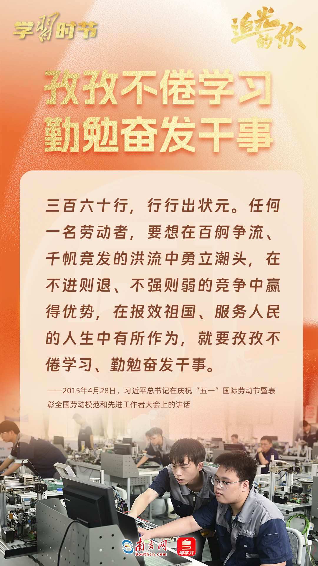勞動譜寫時代華章,奮斗創(chuàng)造美好未來。黨的十八大以來,在以習(xí)近平同志為核心的黨中央帶領(lǐng)下,各行各業(yè)勞動者砥礪奮進(jìn),實干篤行,在全面建設(shè)社會主義現(xiàn)代化國家新征程上書寫奮斗新篇章。習(xí)近平總書記曾多次深情禮贊勞動者,勉勵廣大勞動者拼搏奮斗、爭創(chuàng)一流。