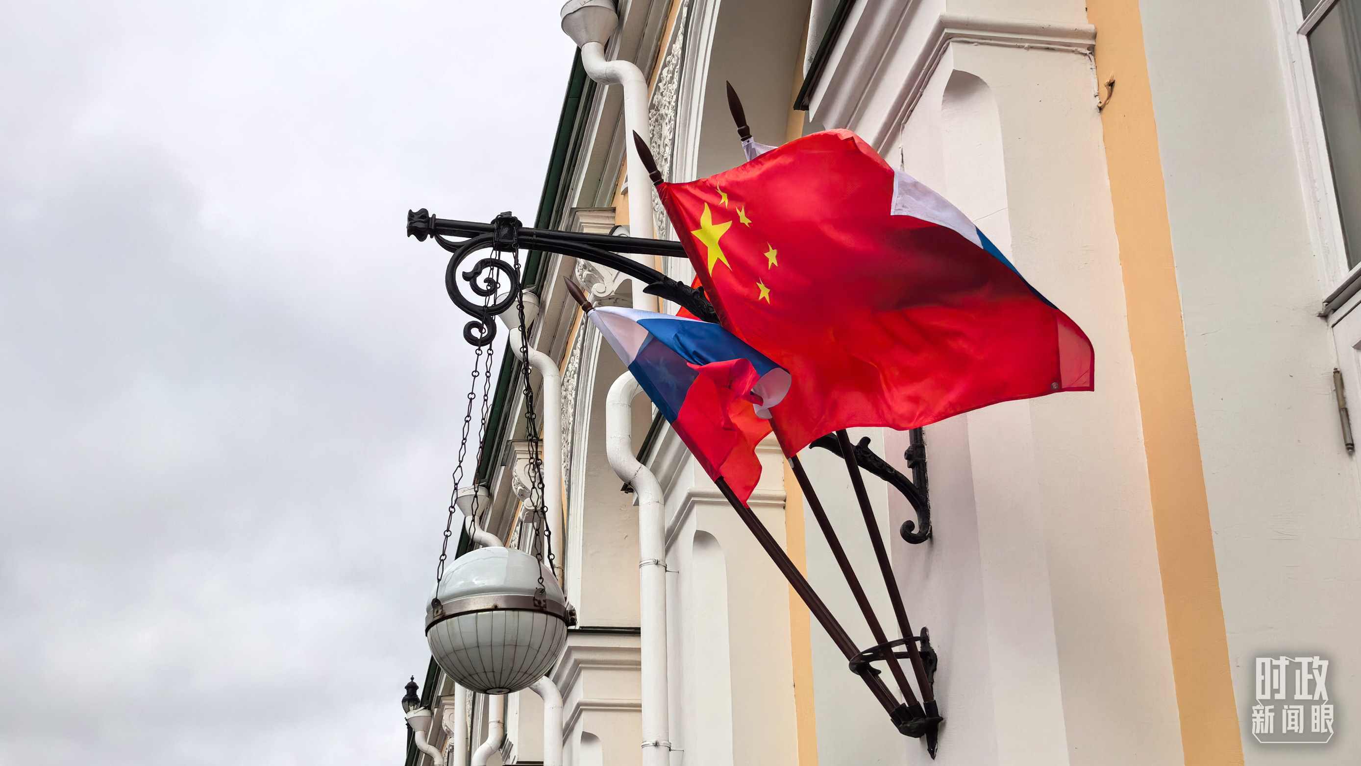 △下車處懸掛的中俄兩國國旗。(總臺(tái)央視記者劉琦拍攝)