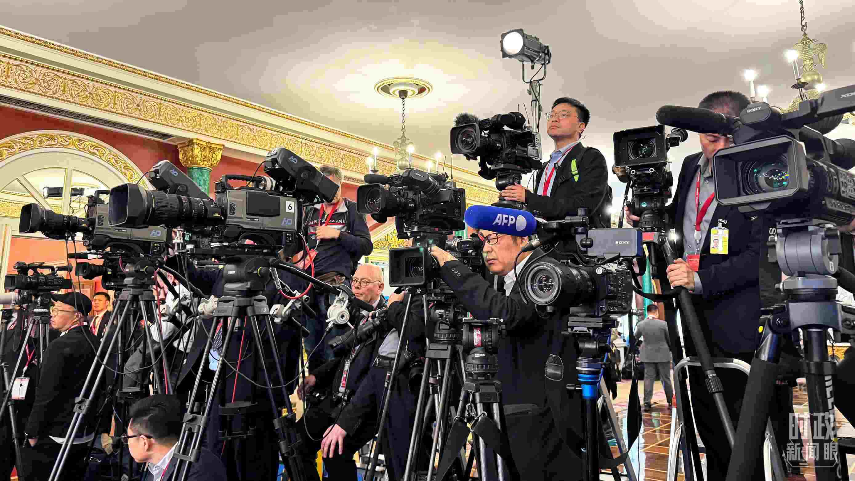 △等待中俄兩國元首共見記者的中外媒體同仁。(總臺(tái)央視記者陸泓宇、蔣碩拍攝)
