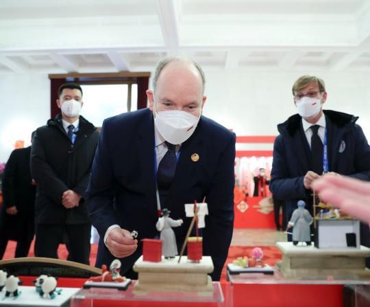 摩納哥元首阿爾貝二世親王被“冰墩墩”面塑所吸引
