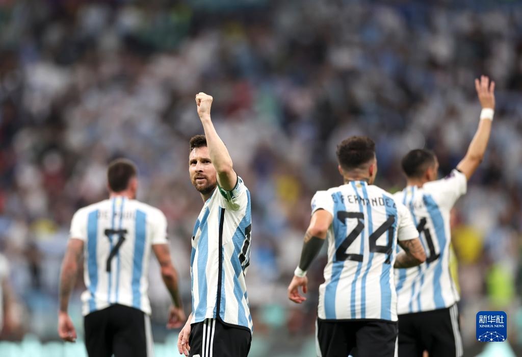 11月26日,阿根廷隊(duì)球員梅西(左二)慶祝進(jìn)球。新華社記者 徐子鑒 攝