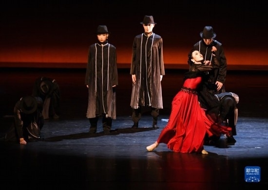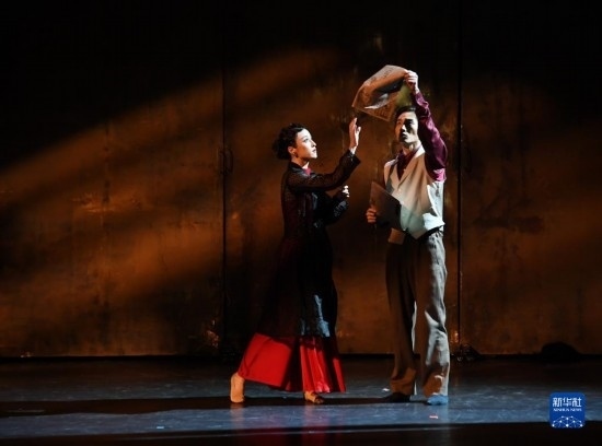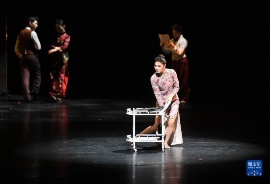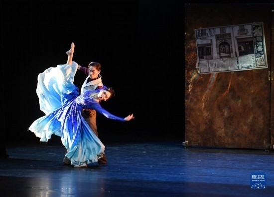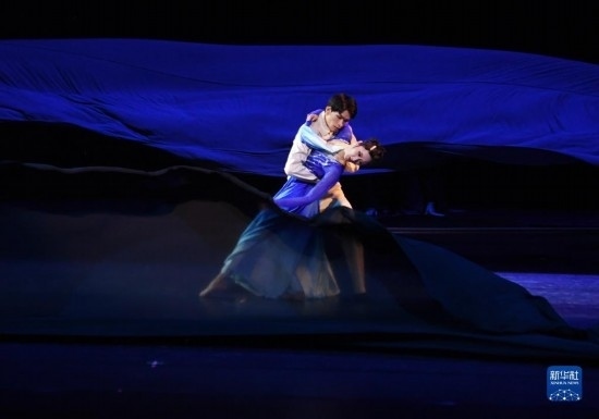 4月3日,演員在舞劇《藍(lán)色裙擺》中表演。