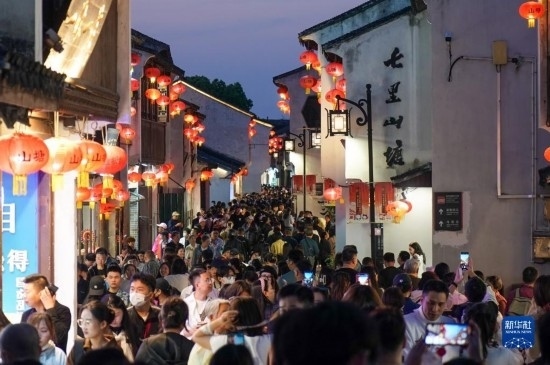 游客在江蘇蘇州山塘街休閑游玩(4月10日攝,無人機(jī)照片)。