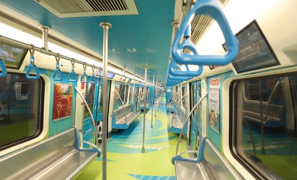 整體車廂打造創(chuàng)新植入了色彩明快、充滿青春氣息的“移動(dòng)運(yùn)動(dòng)場”概念,立面畫面則結(jié)合青春動(dòng)感的大學(xué)生形象,并選用田徑、網(wǎng)球、籃球、體操等運(yùn)動(dòng)的代表性動(dòng)作為設(shè)計(jì)元素,全面凸顯成都大運(yùn)會(huì)賽事核心主題。