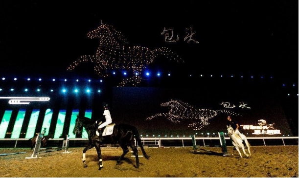 開幕式文體表演由《馬術(shù)方陣一馬當(dāng)先》、歌伴舞《我的城我的馬》、《名馬展示策馬揚(yáng)鞭》、《單馬技巧雙翼神馬》、《馬障礙秀躍馬揚(yáng)鞭》、《馬術(shù)秀人馬合一》、歌伴舞《騎跡包頭》、《無人機(jī)秀馬上精彩》八塊內(nèi)容組成。當(dāng)晚的賽汗塔拉馬術(shù)賽場流光溢彩、氣氛熱烈,場內(nèi)座無虛席、歡聲雷動。20時30分許,主騎手手持國旗,副騎手手持馬城旗幟,運(yùn)動員方陣、民族方陣、女騎方陣、馬主方陣入場,騎手們精神飽滿、英姿颯爽,不時揮手致意,現(xiàn)場觀眾用熱烈的掌聲和歡呼聲,歡迎他們的到來。達(dá)茂旗9歲賽馬冠軍阿茹樂手持彩旗引出世界名馬亮相,40對人馬合一的“千古馬頌”表演震撼全場,1000架無人機(jī)躍然天空,點(diǎn)亮“騎跡包頭 馬上精彩”的字樣……藍(lán)天、碧水、凈土的包頭在策馬奔騰的馬術(shù)競技中拉開了“中國馬城”的壯麗畫卷。