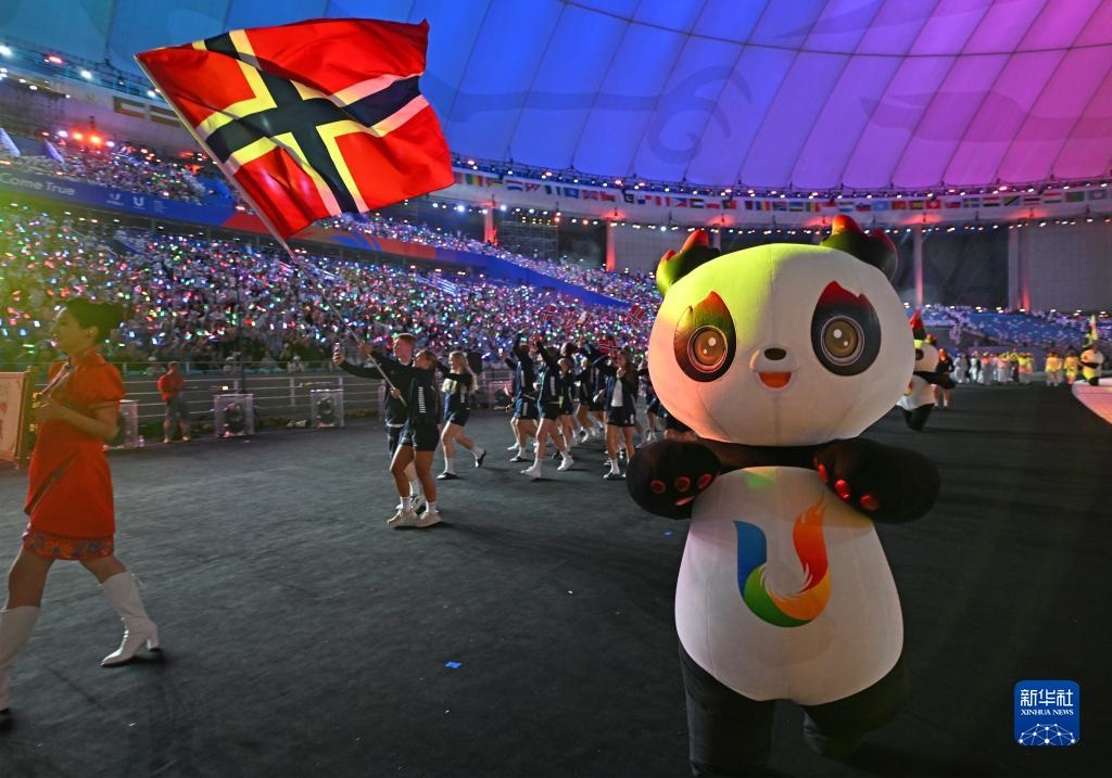 7月28日,挪威大學(xué)生體育代表團(tuán)在開幕式上入場(chǎng)。
