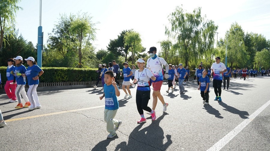 上午8時整,勞動公園彩旗飄揚,1400名青城跑者聚集在此,隨著清脆的笛鳴響起,身著藍色運動服的青城跑者們奔跑在陽光照射下的步道上,沿途盡賞青城美景,盡享運動健身之樂。
