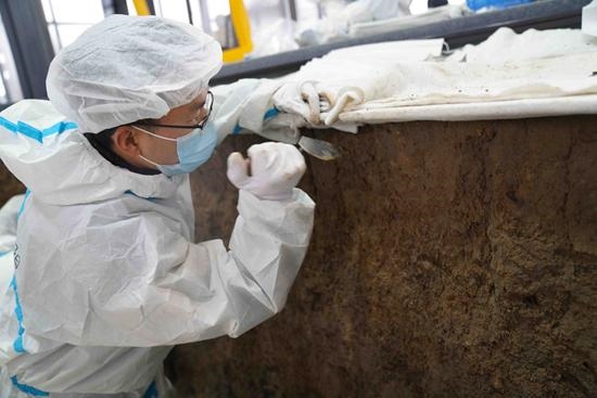 在三星堆遺址,考古發(fā)掘現(xiàn)場被大跨度鋼結(jié)構(gòu)大棚覆蓋,里面有數(shù)個“考古發(fā)掘艙”,不僅能控制溫度、濕度,還能減少工作人員從外界帶入的物質(zhì)干擾。而眼前的考古工作者,更像在實驗室工作,穿著全副武裝的白色“防護服”,趴在“非接觸式裝置”上,懸在祭祀坑上方,拍照、清理……頗有科幻電影的即視感。