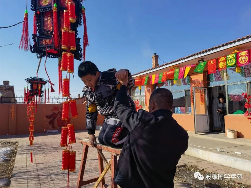 父親讓曈曈接地氣的愿望實現(xiàn)了,長得越來越壯實的曈曈真是打心眼喜歡上了農(nóng)村,喜歡看叔叔大爺們是如何勞動的。春天澆地的時候,他跟上我的發(fā)小利利到地里去,手里拿上一張鐵鍬學(xué)著去攏堰堤;秋收的時候他爬上了丁補(bǔ)元駕駛的收割機(jī),感受農(nóng)民們收割玉米的喜悅;接羔的時候,他又鉆進(jìn)利軍家的羊群里,抱著出生沒有幾天的小羊羔,給小羊羔喂牛奶……春節(jié)前的一兩天是他最忙的時候:一會跟上大爹貼春聯(lián),一會跟上茹義大爺掛紅燈,忙得不亦樂乎。前一段時間回村里他又要跟上利軍大爺出村放羊去,又要跟上茹義大爺去種玉米,在城里他是見識不到這些的。