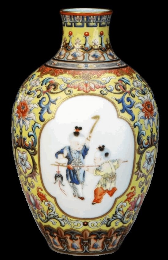 清乾隆·黃地琺瑯彩開光嬰戲紋瓶。開光是指在器物的顯著部位以線條勾勒出圓形、方形、菱形、扇面形、云頭形或花形等多種式樣的欄框,框內(nèi)繪各種圖案,起到突出主題紋飾的作用。此法猶如古建筑上開窗見光,故名開光。(圖片來源:故宮博物院)