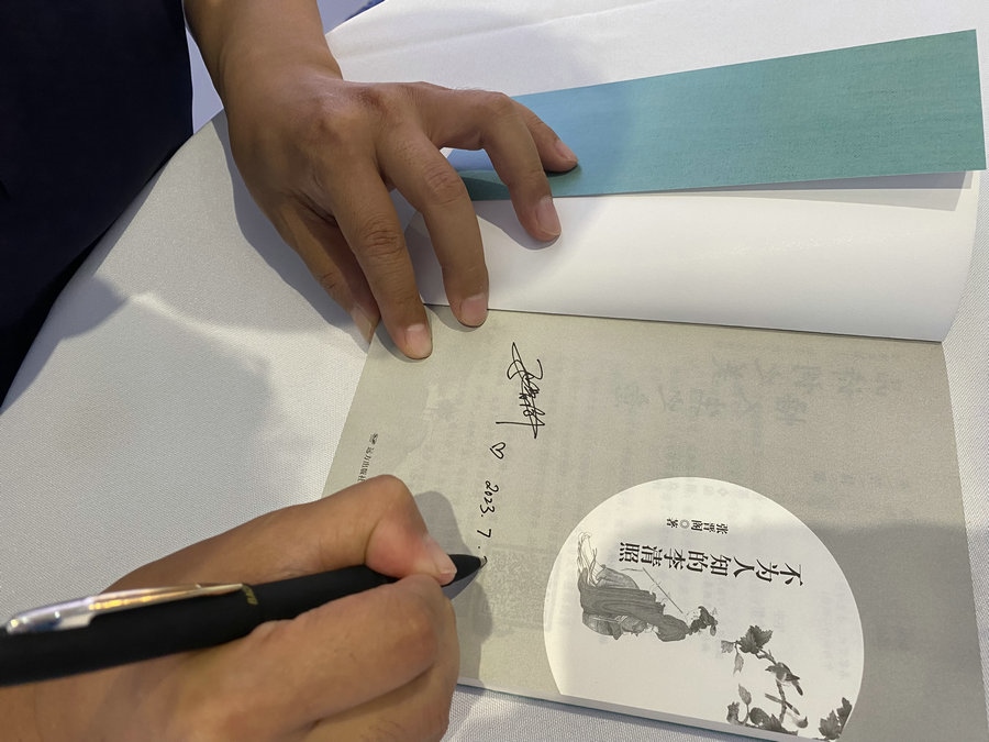圍繞某些宋人作品中記載的李清照“流落以死”、李清照卒年的多版本說法、李清照的詩詞風格為什么會從婉約轉(zhuǎn)變到豪放等“疑點”,張晉閣先生為大家講述了《不為人知的李清照》的寫作緣由、研究經(jīng)歷、文字表達形式和內(nèi)心希冀。隨后,兩位讀者分別提出“您最喜歡李清照的哪一首詩詞”、“對李清照的寫作產(chǎn)生深遠影響的人是誰”這兩個問題,張晉閣先生分享了自己的看法并朗誦了優(yōu)美的詩詞佳作,現(xiàn)場交流、互動氣氛熱烈。活動結(jié)束后,張晉閣先生為讀者朋友們簽名留念。多位年輕讀者表示,通過閱讀《不為人知的李清照》,加深了他們對古典詩詞的喜愛。