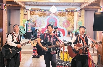 在云南省瀾滄拉祜族自治縣,拉祜族房東扎努的民宿在國慶節(jié)假期迎來滿房。今年4月,扎努改造自家老房子,把民族音樂與民宿相結(jié)合,開了一家音樂民宿——拉祜音宿?!袄镒迨悄芨枭莆璧拿褡?。我喜歡與人交流,喜歡鄉(xiāng)村風(fēng)光和家鄉(xiāng)氣候,所以選擇回鄉(xiāng)開民宿?!弊鳛榉繓|,扎努常常帶游客一起唱歌跳舞,表演他創(chuàng)作的《我在瀾滄等你》《快樂拉祜》等歌曲,并向他們介紹拉祜族的民族歷史和文化。