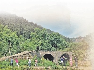 游客在修繕后的黃虎村雙孔橋游覽。張藝文攝