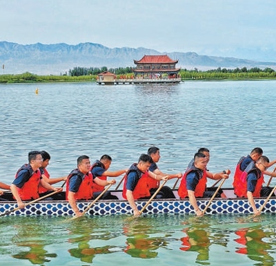 龍舟隊(duì)在甘肅高臺(tái)大湖灣水域競(jìng)渡。