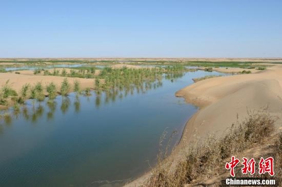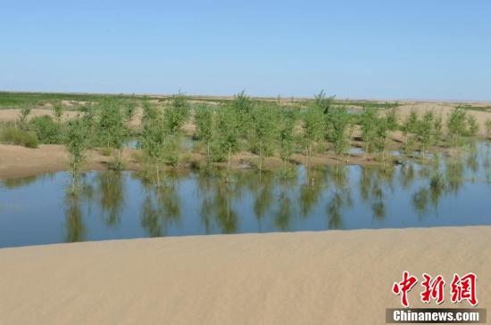 7月24日,引自黃河的凌水讓沙漠上充滿生機。據悉,中國第七大沙漠--庫布齊沙漠所處的杭錦旗境內,每年過境水量310億立方米,當地一年三分一的時間都是凌汛期。政府因地制宜,2016年投資建成分凌引水渠、生態(tài)圍堤等設施,自2016年至2018年黃河凌汛期以來,累計分凌5千余萬立方米,形成約36平方公里保護濕地的面積,原來為沙漠的地貌逐漸變成綠洲,農牧民開始發(fā)展野牛養(yǎng)殖與農家樂旅游業(yè)。中新社記者劉文華攝