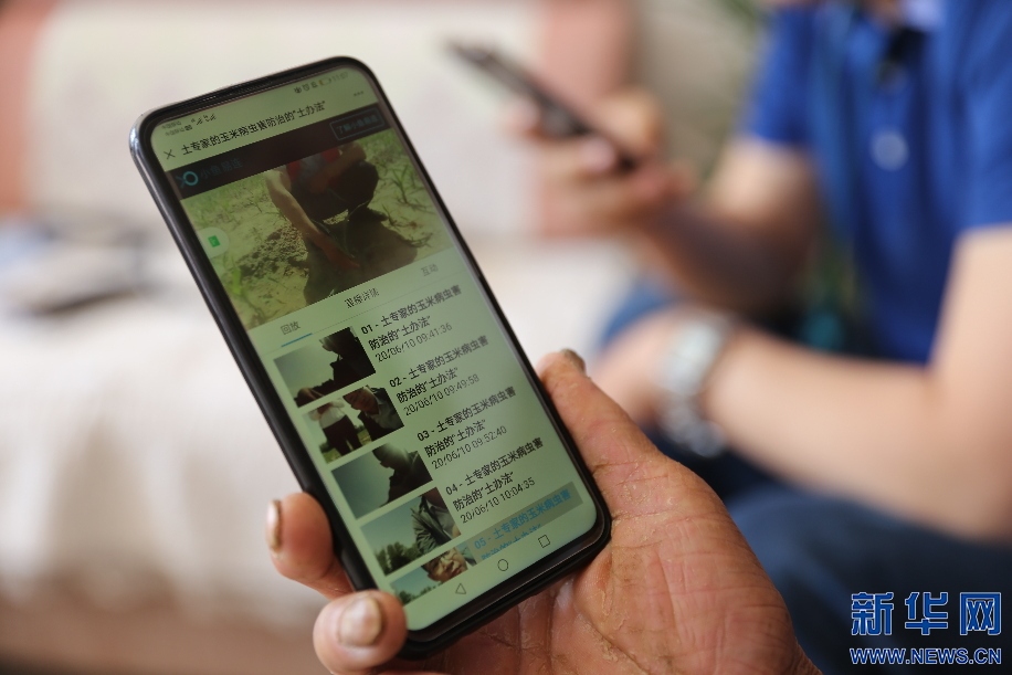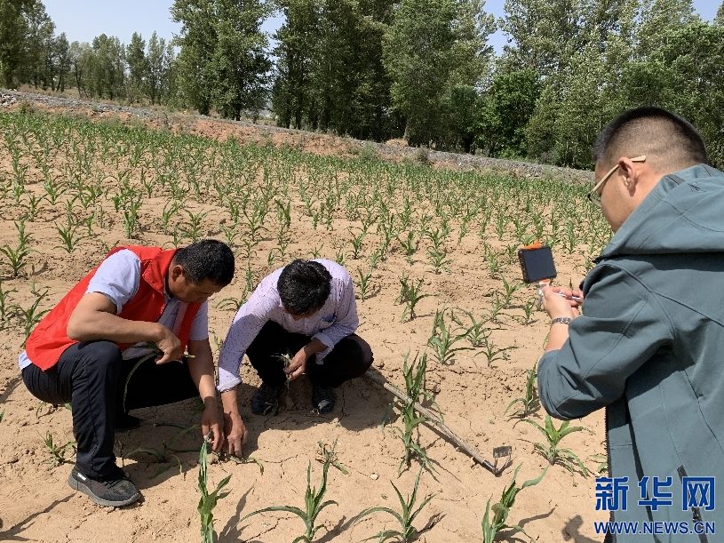 6月10日,內(nèi)蒙古自治區(qū)烏審旗無定河鎮(zhèn)農(nóng)業(yè)“土專家”在玉米地里針對小地老虎病蟲害問題,進(jìn)行線上直播,向當(dāng)?shù)剞r(nóng)民講解防治方法。新華網(wǎng)曹楨攝