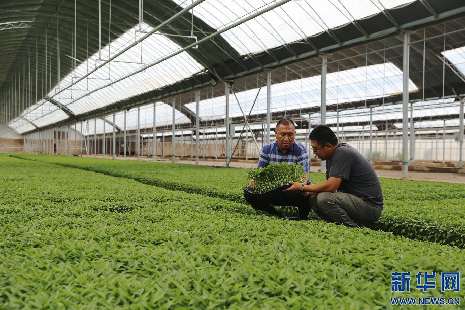 6月9日,內(nèi)蒙古自治區(qū)鄂托克前旗農(nóng)民李宏(左)和兒子李鵬博在育苗大棚里查看辣椒育苗情況。新華網(wǎng)曹楨攝