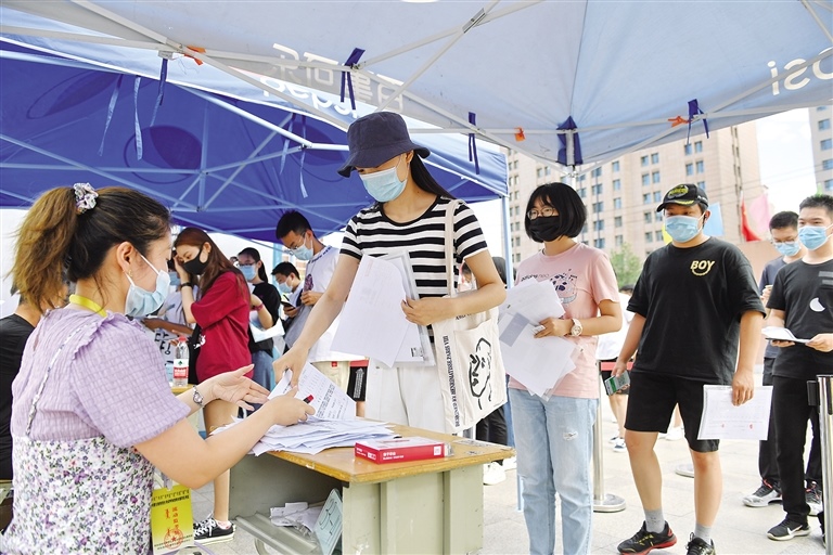 7月6日,工作人員對(duì)提前到高考考點(diǎn)查看考場(chǎng)的首府高三學(xué)子查驗(yàn)考生資料。