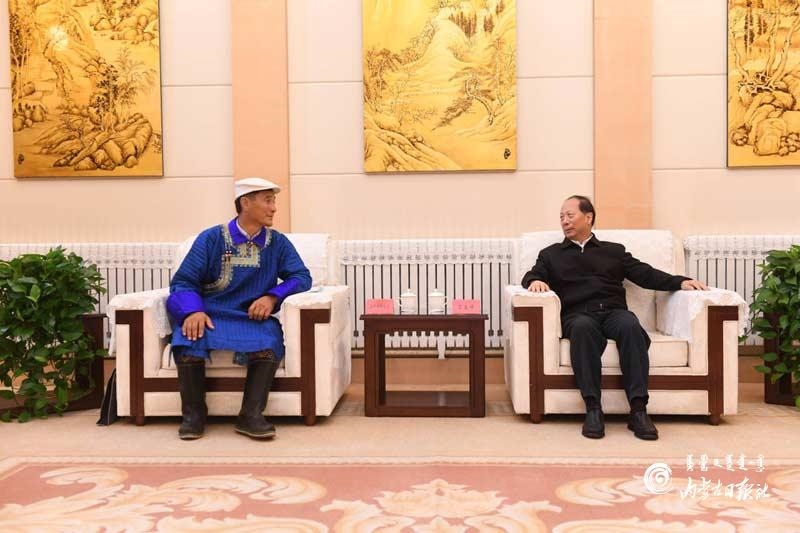 7月29日,自治區(qū)黨委書記、人大常委會主任石泰峰在主持召開草原生態(tài)保護補助獎勵政策實施情況專題匯報會前,會見自治區(qū)人大代表浩畢斯嘎拉圖。內(nèi)蒙古日報記者袁永紅攝