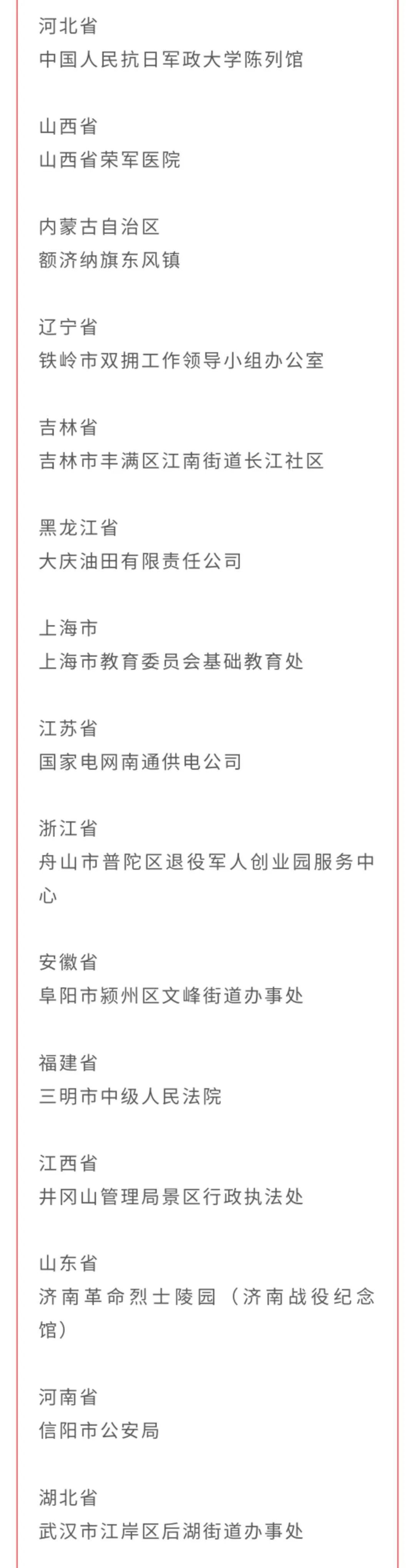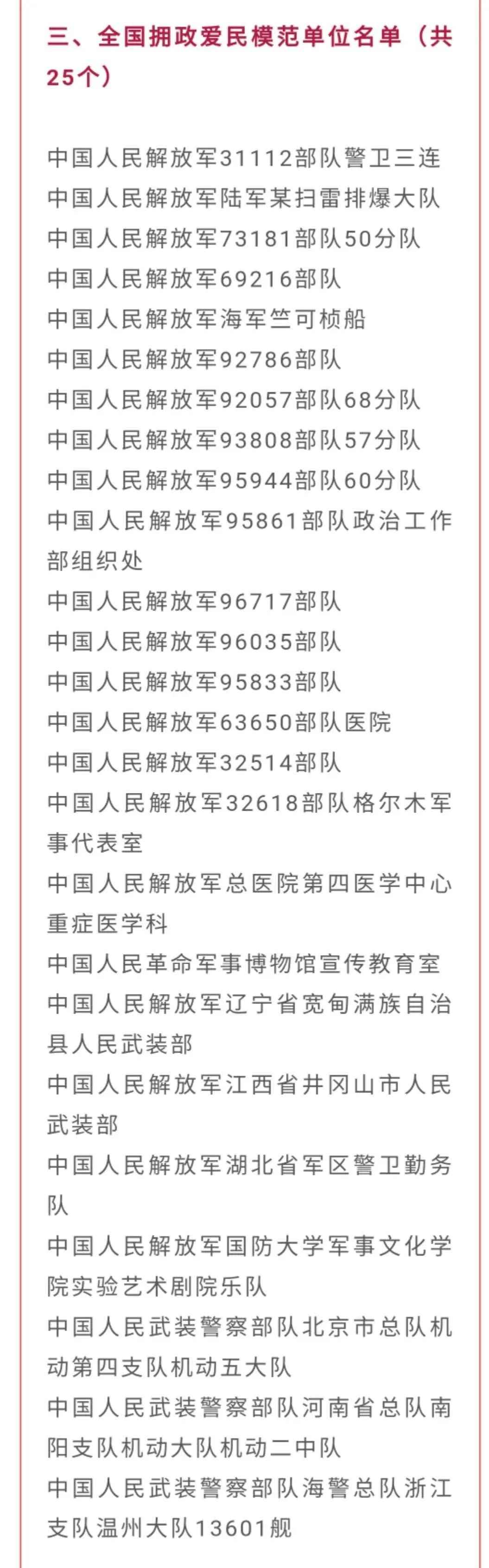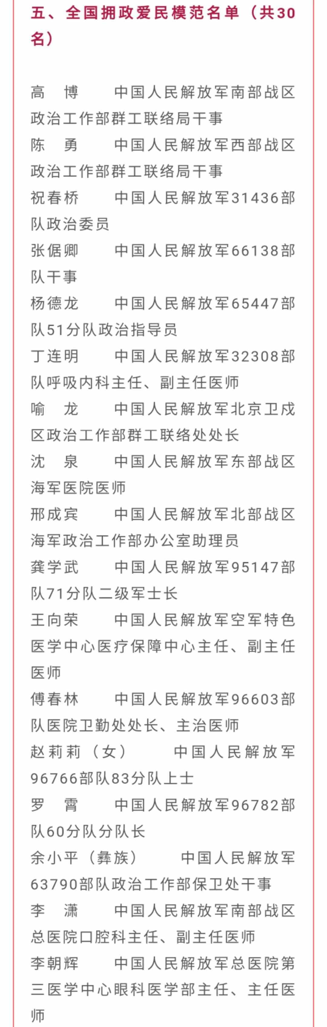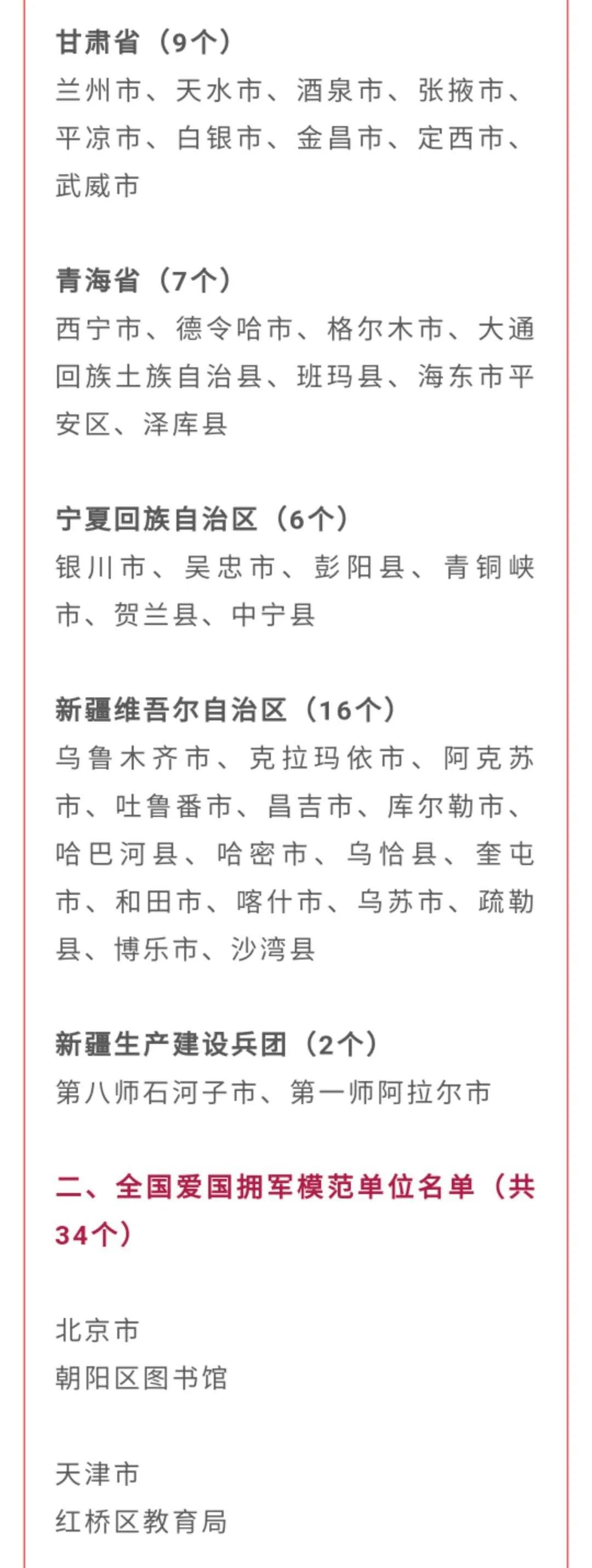 全國雙擁模范城(縣)、全國愛國擁軍模范單位和擁政愛民模范單位、全國愛國擁軍模范和擁政愛民模范名單
