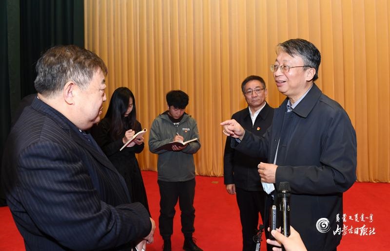 11月8日上午,在學習貫徹黨的十九屆五中全會精神中央宣講團內蒙古報告會結束后,聆聽報告會的部分人員與宣講人沈春耀互動交流。內蒙古日報記者 袁永紅 攝