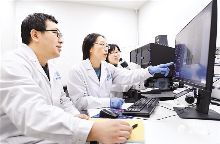內(nèi)蒙古大學(xué)生命科學(xué)學(xué)院院長、省部共建草原家畜生殖調(diào)控與繁育國家重點(diǎn)實(shí)驗(yàn)室主任胡薇(中)與團(tuán)隊(duì)成員觀察動物的成纖維細(xì)胞結(jié)構(gòu)形態(tài)。內(nèi)蒙古日報社融媒體記者