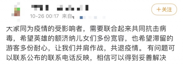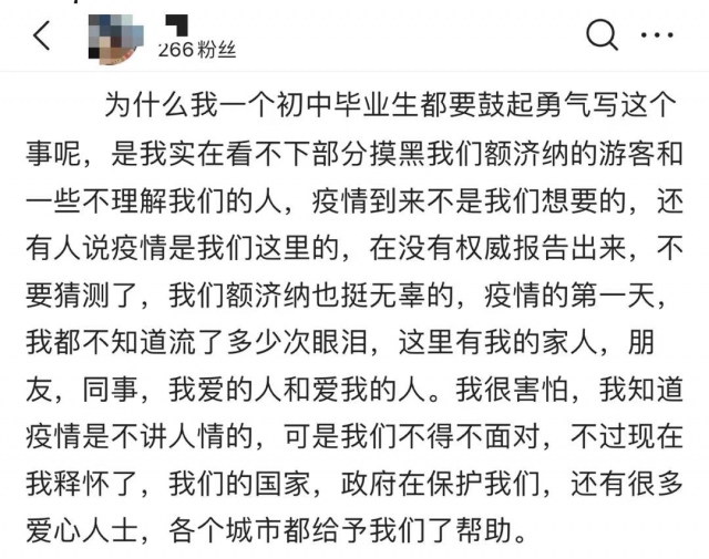 在社交媒體上,一名王姓女士通過短視頻呈現(xiàn)了一家人滯留額濟(jì)納的境況,在視頻中,她為同樣滯留在此的游客鼓勁:“如果你此時(shí)正在阿拉善,愿你如胡楊般堅(jiān)強(qiáng),積極應(yīng)對(duì)疫情。”這條短視頻發(fā)出數(shù)小時(shí),就吸引了20余萬瀏覽量。