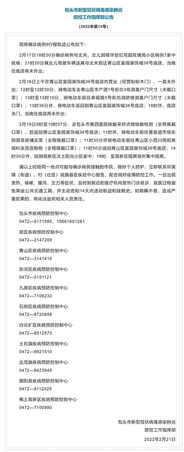 記者從相關(guān)部門(mén)獲悉,內(nèi)蒙古包頭市新型冠狀病毒感染肺炎防控工作指揮部發(fā)布公告,公布確診病例9行程軌跡,詳情如下: