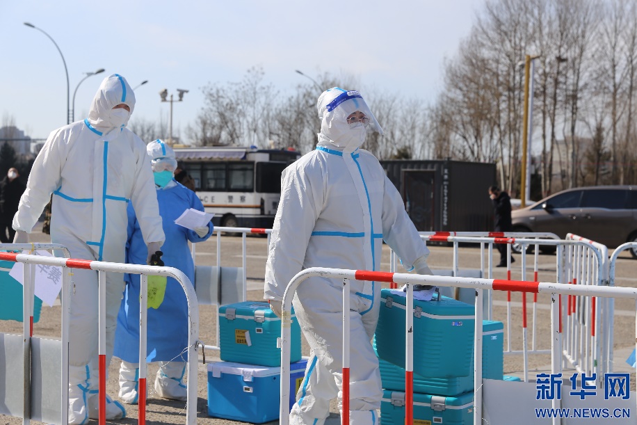 2月20日上午11時,籍東斌和工作人員將三個核酸采樣點的樣本送至方艙實驗室核酸檢測基地。新華網(wǎng)發(fā) 李倩攝