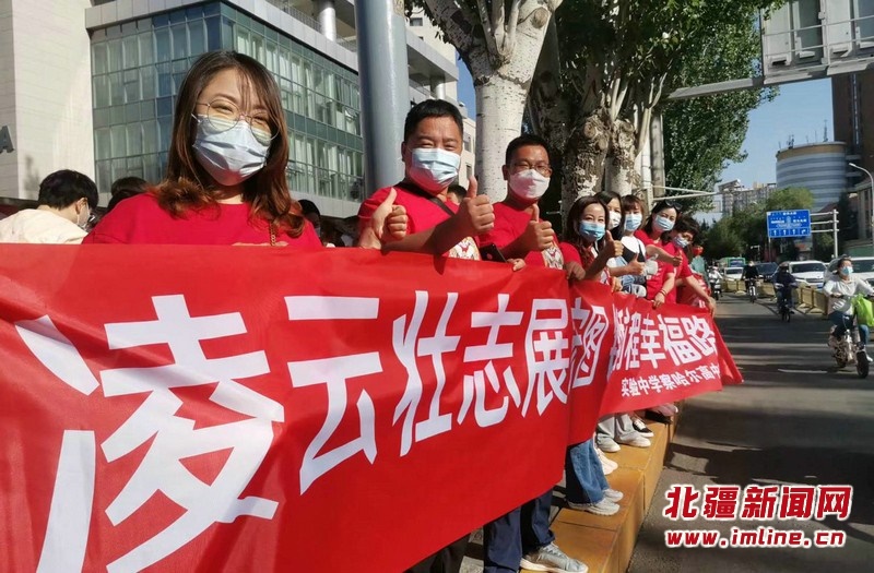 呼和浩特市實驗中學(xué)察哈爾校區(qū)的送考教師身穿旗開得勝的紅色T恤,戴印有“金榜題名”的紅色口罩為學(xué)生加油助威,并祝愿所有考生“凌云壯志展宏圖 錦繡前程幸福路”。