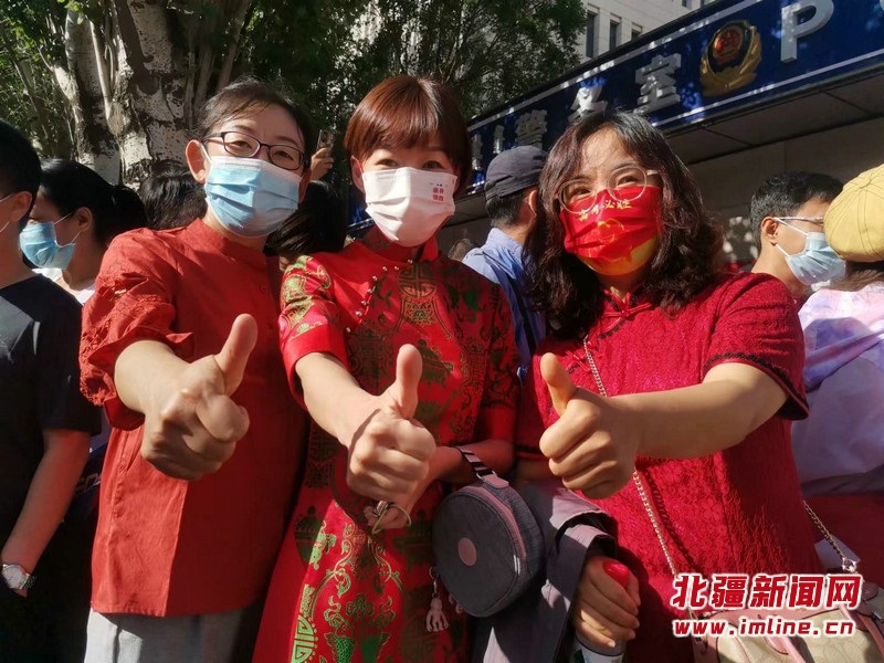 呼和浩特市第二中學(xué)和呼和浩特市土默特中學(xué)送考教師身著旗袍,祝愿孩子們“旗開得勝”。