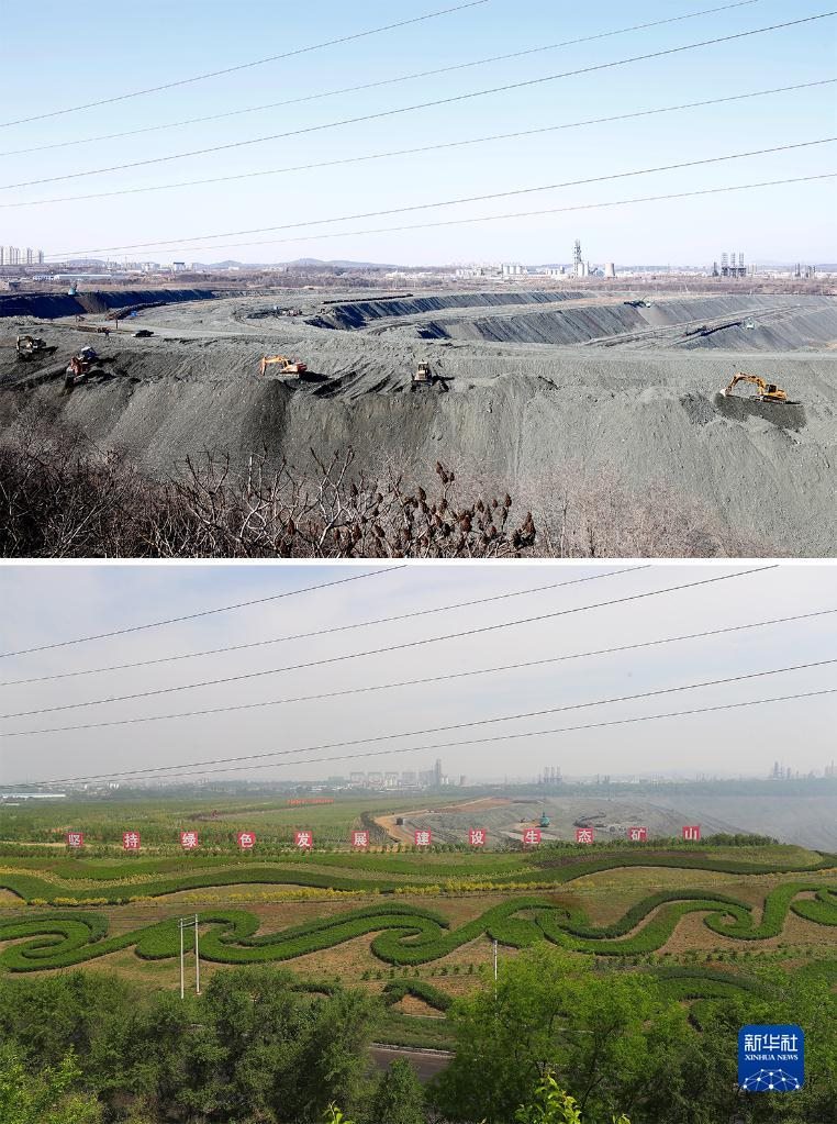 這是一張拼版照片:上圖為遼寧省撫順市西露天礦部分區(qū)域生態(tài)恢復(fù)前的場(chǎng)景(2019年3月6日攝,資料照片);下圖為2022年6月2日拍攝的遼寧省撫順市西露天礦部分區(qū)域生態(tài)恢復(fù)后的場(chǎng)景(新華社記者楊青攝,無人機(jī)照片)。新華社發(fā)