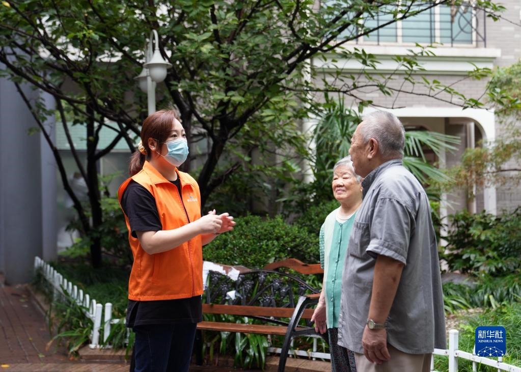 在上海靜安區(qū)石門(mén)二路街道新??道铮用駞^(qū)黨總支書(shū)記魏瑛(左)在和居民交流(2022年9月15日攝)。新華社記者 劉穎 攝