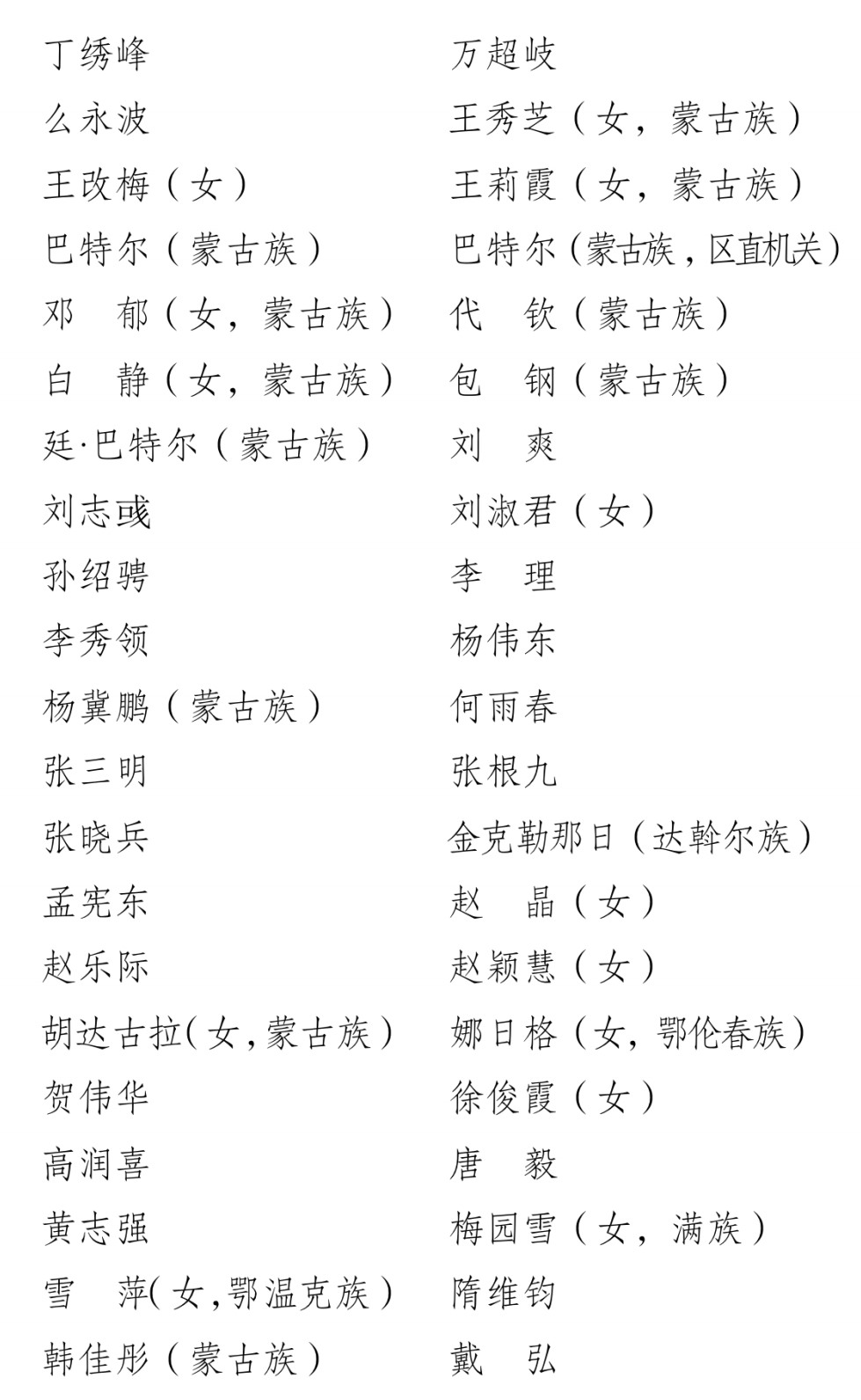 6月30日,內(nèi)蒙古自治區(qū)黨代表會(huì)議選舉產(chǎn)生出席黨的二十大代表42名。代表名單如下(按漢字姓名筆畫(huà)為序):